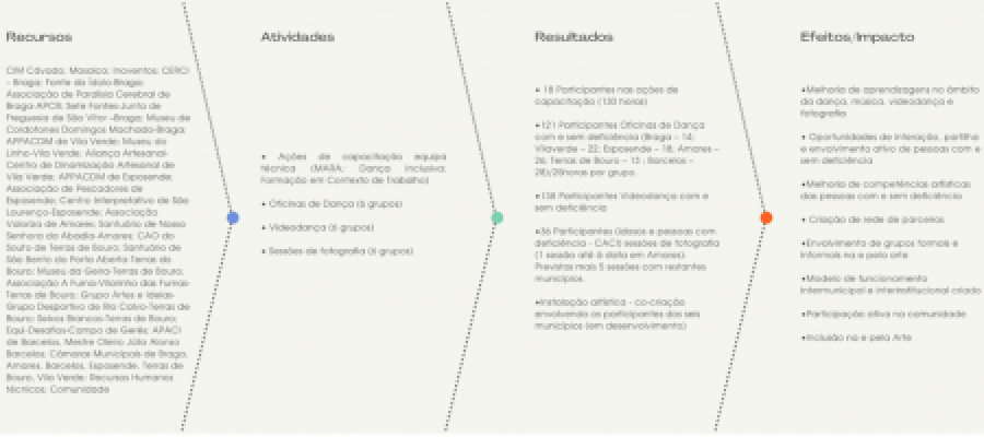 O Projeto seguiu um modelo lógico que se apresenta de seguida com a identificação dos recursos, as atividades desenvolvidas, os resultados mensuráveis, os efeitos e os impactos a alcançar.