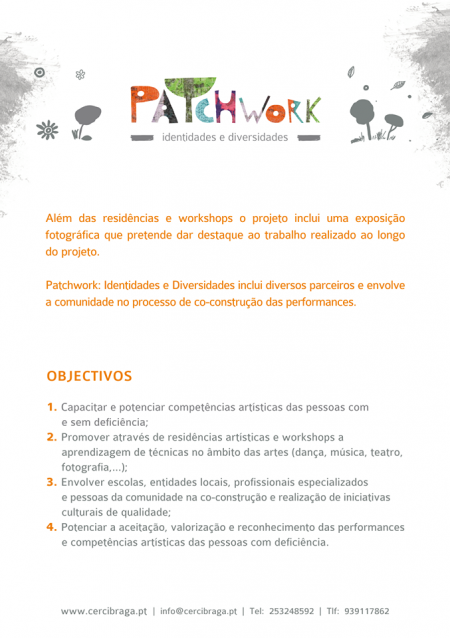 Um projeto com a Cerci Braga e comunidade (2020) foi criado, na sequência de 5 anos de trabalho com a instituição e com a comunidade de Braga tendo em conta que no concelho de Braga os projetos de dança para pessoas com deficiência recorrem a abordagens essencialmente de cariz mais terapêutico, persistindo as um trabalho centrado nas incapacidades em detrimento do potencial artístico dos adultos com deficiência. Através da auscultação de escolas e de entidades que intervêm na reabilitação das pessoas com deficiência denotou-se uma descrença relativamente às suas capacidades ao nível dança, música ou teatro, o que levou a mudar o foco deste projeto para o desenvolvimento das competências artísticas, ambicionando além da intervenção terapêutica p envolvimento da comunidade local (escolas, bailarinos, músicos) num processo de co construção artística través da videodança, da dança, do teatro e da música. Neste projeto o foco centra-se ao nível da promoção da acessibilidade a iniciativas ou projetos que permitam uma igualdade de oportunidades ao nível da capacitação artística, nomeadamente, ao nível da dança, música, teatro, fotografia ou outra, entendendo que a exploração de competências pela arte, cultura, … pode potenciar a inclusão e contrariar a tendência para a exclusão, perda de competências artísticas, mas também de quadros de deterioração física, e psicológica. Assim, este projeto tendo como base a dança, pretende explorar competências diversas no âmbito da música, teatro e fotografia, envolver diferentes entidades, artistas profissionais e outras pessoas com e sem deficiência. A avaliação implicará uma auscultação dos participantes, das famílias e dos formadores/técnicos envolvidos mediante instrumentos de avaliação que incluem: questionários e relatórios de observação das sessões. Entre outros indicadores o número de espetadores nas apresentações, o número de apresentações, número de participantes envolvidos, serão considerados para monitorização e concretização dos objetivos do projeto.